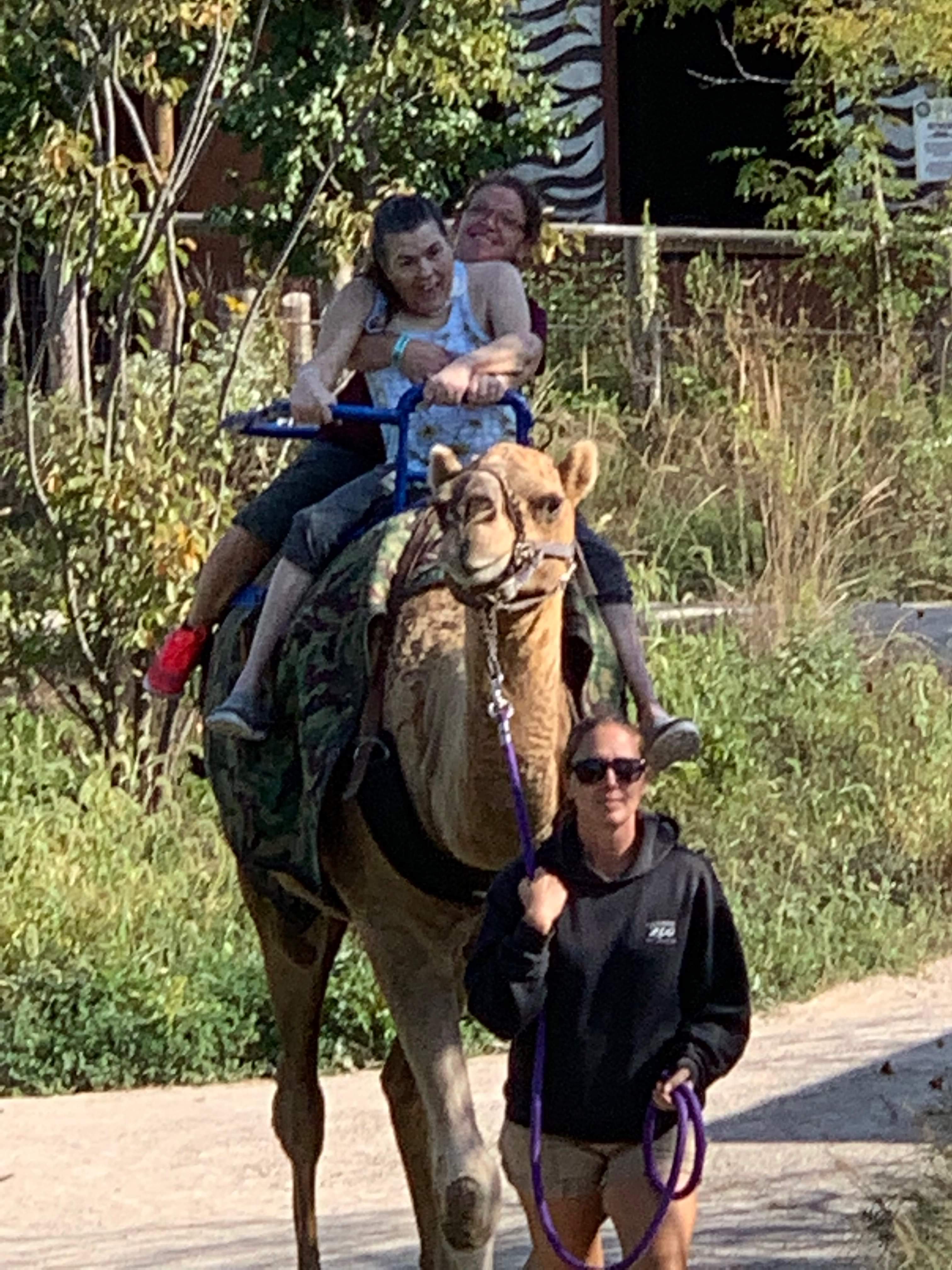 "Keep Calm and Camel On!" -- Tina Mirando, a resident at Bennington Glen, Marengo, rides a camel at the Columbus Zoo.